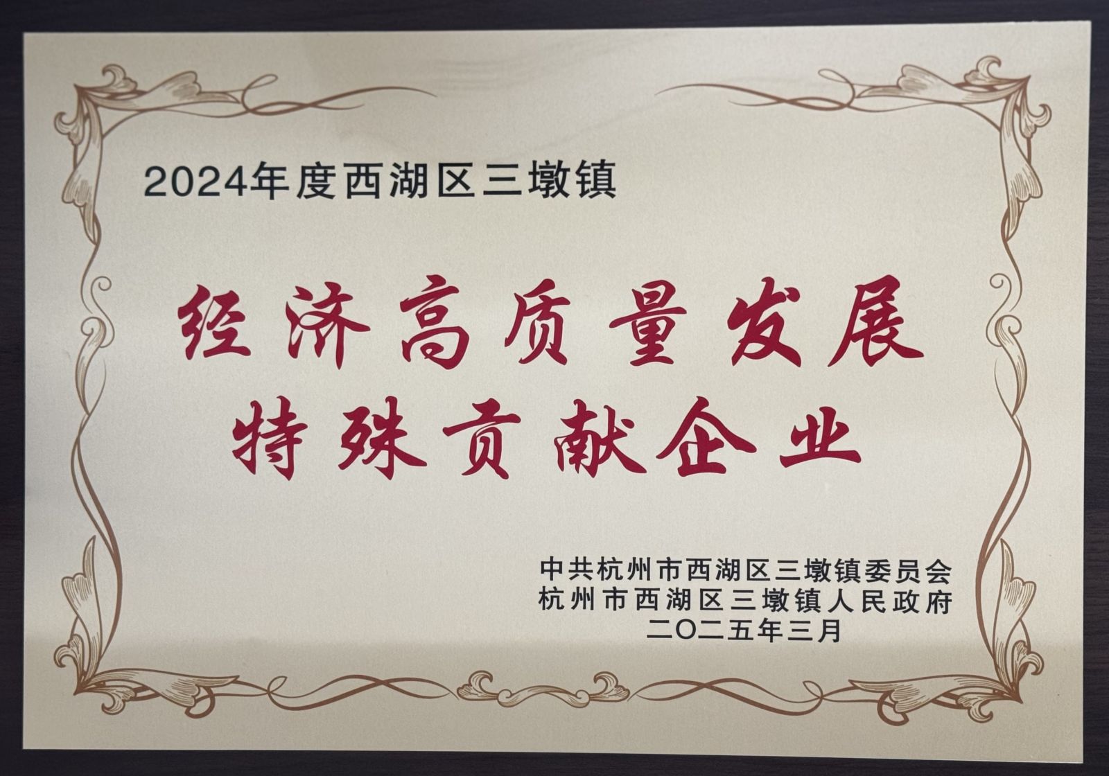On March 23, 2025, Hangzhou Lvpu New Materials Co., Ltd. was invited to participate in the "2025 Sandun Town Economic High Quality Development Conference" hosted by the People's Government of Sandun Town, Xihu District, Hangzhou Zhejiang University Alumni Association, Zhejiang Province Industry University Research Cooperation Promotion Association, 1897 Science and Technology Innovation Valley , and was awarded the honorary title of "Special Contribution Enterprise for High Quality Economic Development" in Sandun Town, Xihu District in 2024.